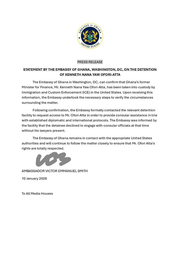 The Embassy of Ghana in Washington, DC, has confirmed that Ghana’s former Minister for Finance, Kenneth Nana Yaw Ofori-Atta, has been taken into custody by the United States Immigration and Customs Enforcement (ICE). In a press release issued on Friday, January 10, 2026, and signed by Ghana’s Ambassador to the United States, Victor Emmanuel Smith, the Embassy said it received information regarding Ofori-Atta’s detention and immediately took steps to verify the circumstances surrounding the matter.