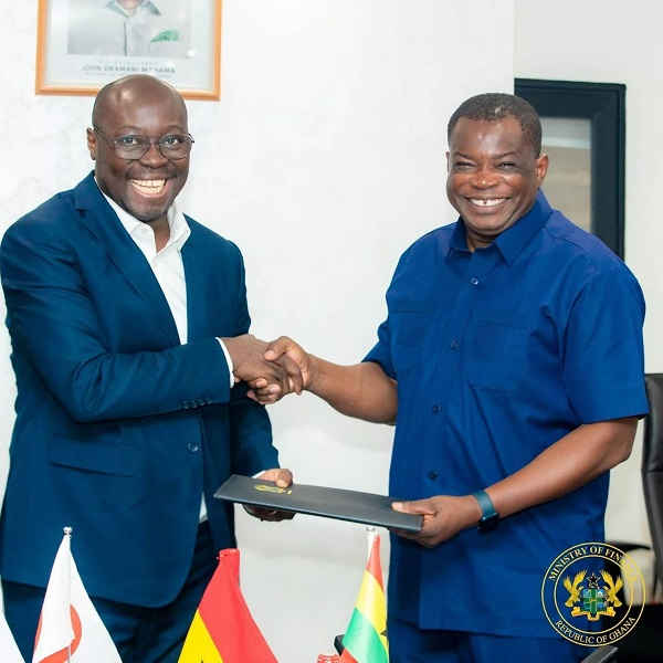 Minister of Finance Dr Cassiel Ato Forson and Minister for Roads and Highways, Governs Kwame Agbodza at the signing ceremony