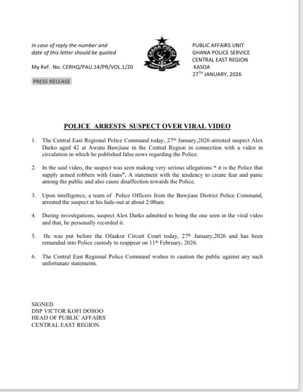 “He was put before the Ofaakor Circuit Court today, January 27, 2026, and has been remanded into Police custody to reappear on February 12, 2026,” the statement said. The Central East Regional Police Command also cautioned the public against making unverified and inflammatory statements capable of undermining public confidence in security institutions.